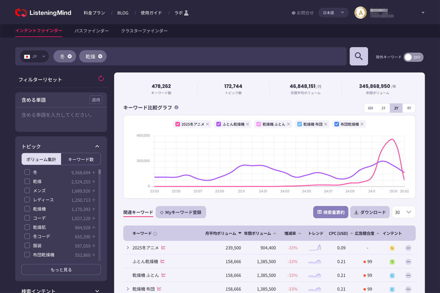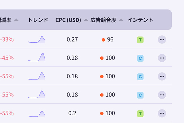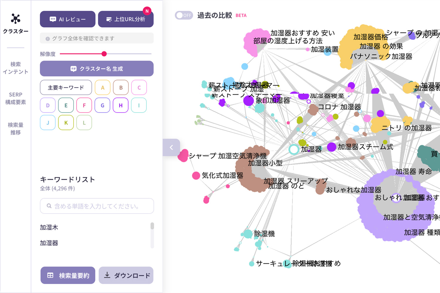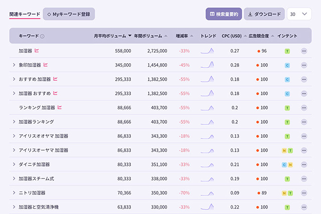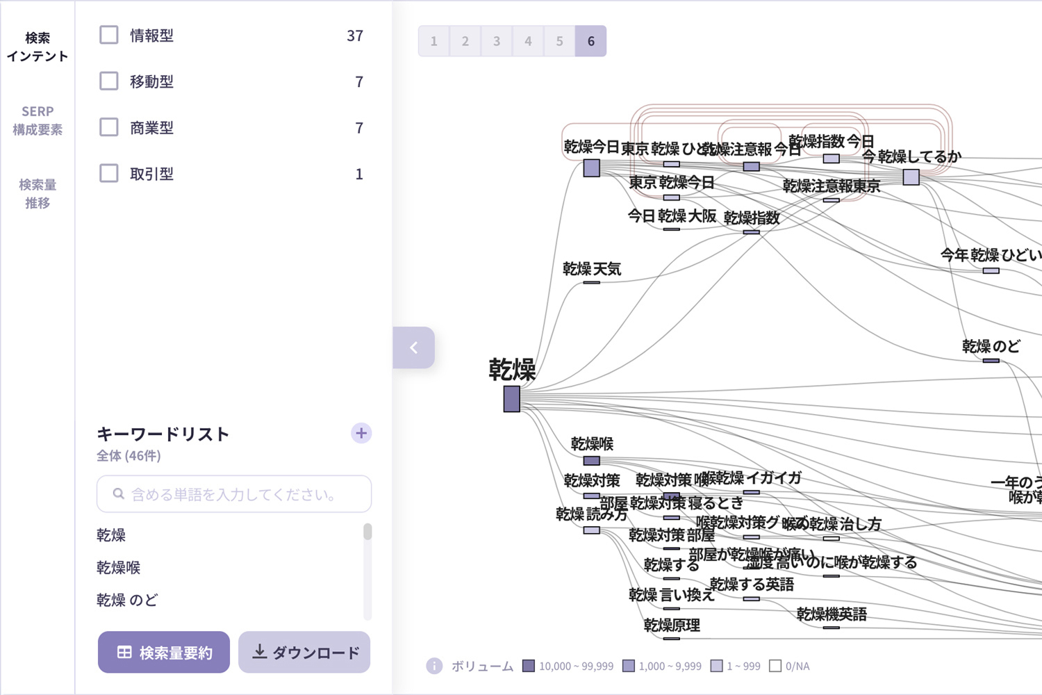 シードキーワードを起点に関連語を網羅的に抽出・構造化し、検索行動の背景にある“意図=インテント”を可視化します。