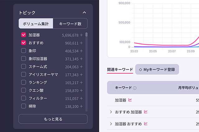 ホットトピックを可視化各キーワードの検索数やトピックごとの